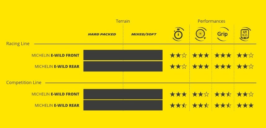 Pneumatika MICHELIN E-WILD FRONT Racing Line je navržena tak, aby jezdcům extrémních e-VTT poskytla maximální přilnavost. Její specifický dezén zaručuje vynikající kontrolu při sjezdu a vzbuzuje důvěru v dosažení vysokých rychlostí v naprostém bezpečí. Její směs MICHELIN Magi-X, která se dobře chová i při nízkých teplotách, zajišťuje optimální přilnavost v tom nejnáročnějším terénu.