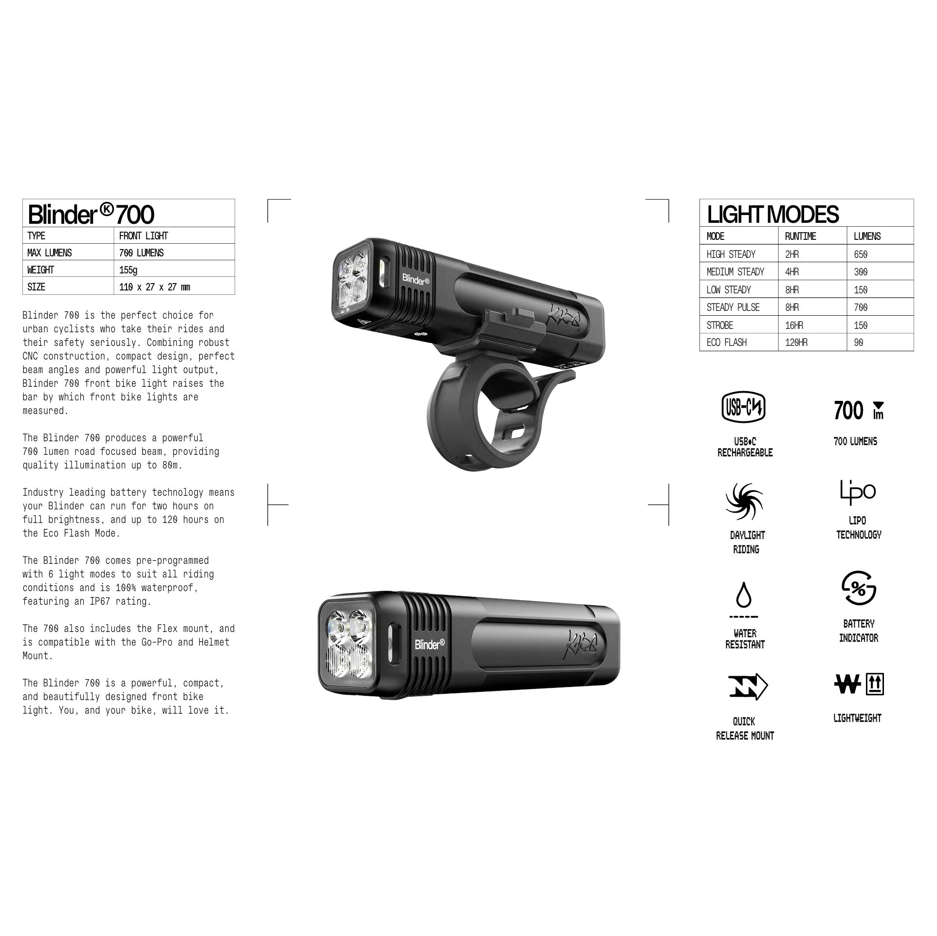 L'éclairage Avant KNOG BLINDER PRO 700 est conçu pour les cyclistes urbains recherchant sécurité et performance. Grâce à sa construction CNC solide et son design compact, il offre une robustesse et une fiabilité optimales tout en restant léger sur le vélo. Ses angles de rayonnement ont été étudiés pour maximiser la visibilité et assurer une sécurité accrue sur route.