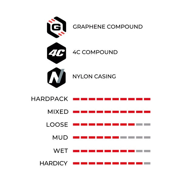 Dezén 4C se skládá ze 4 grafenových zón pro větší odolnost a bezkonkurenční trakci na technických tratích. Plášť Martello je také postaven na 2vrstvém plášti Enduro 120 TPI, který zajišťuje vysoký výkon, maximální trvanlivost a vynikající odolnost proti proražení.