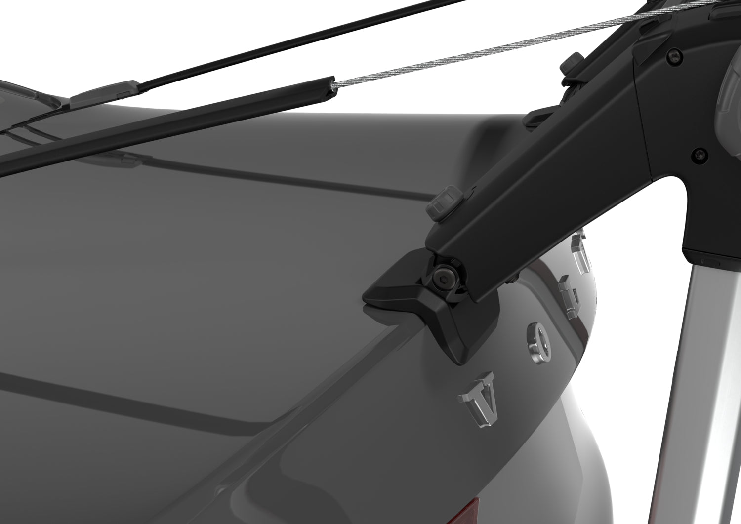 Montaż zapewnia podwójny system haków i wytrzymałych stalowych linek, zabezpieczonych gumowymi powłokami na wszystkich powierzchniach styku, gwarantując bezpieczne i stabilne mocowanie bagażnika rowerowego do pojazdu.