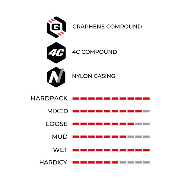 Bieżnik 4C składa się z 4 stref grafenowych, które zapewniają większą odporność, a także niezrównaną przyczepność na technicznych trasach. Opona Agarro została również zaprojektowana w oparciu o karkas 100 TPI Trail , gwarantujący wysoką wydajność i doskonałą odporność na rozdarcia i przebicia. Ochrona przed przebiciem, wkładka stabilizująca i technologia Bead Shield gwarantują maksymalną ochronę i wsparcie.