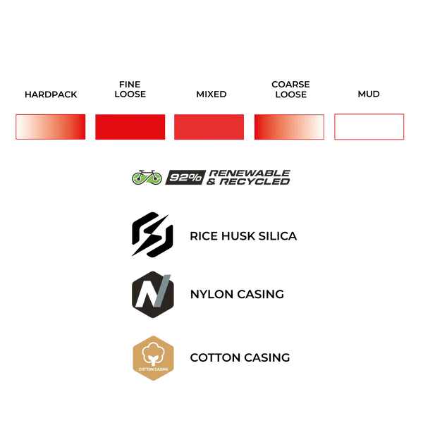 Le Terreno PRO T50 se distingue également par son engagement écologique : il est fabriqué à 92 % de matériaux renouvelables et recyclés, ce qui en fait le pneu le plus durable jamais conçu par Vittoria. Malgré cela, il reste 7 % plus rapide, 9 % plus adhérent et 34 % plus résistant aux crevaisons que la moyenne de ses concurrents.