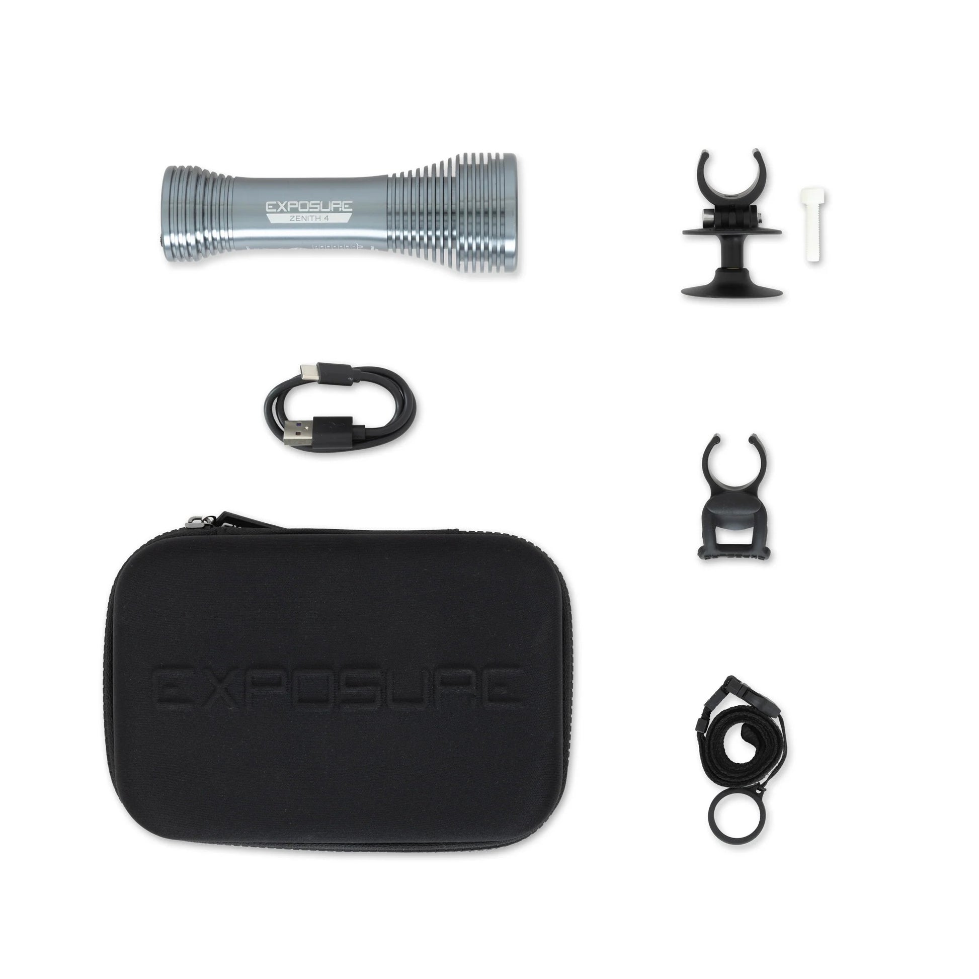 Contenu du pack : Lampe Zenith Mk4, support casque, câble et chargeur USB-C.